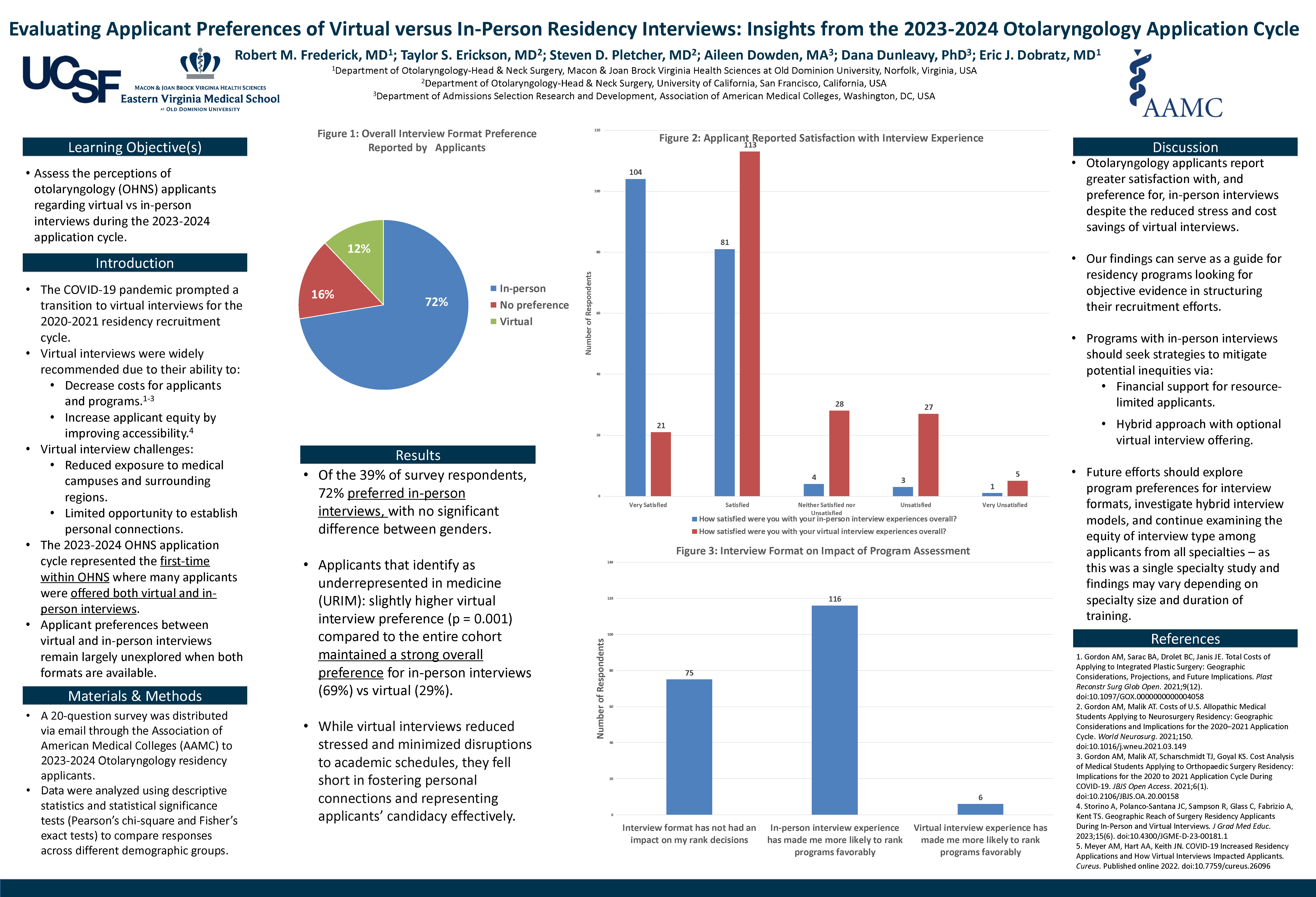 Frederick: Virtual interviews became a necessity during the COVID-19 pandemic. This format proved advantageous for its cost savings for both programs and applicants, improved geographic reach for applicants, and overall convenience. Despite this, many desired a return to in-person interviews, as applicants reported they had more difficulty standing out, adequately assessing programs’ culture and medical campuses, and determining overall fit via virtual interviews. There was a gap in the literature for objectively demonstrating applicants’ interview format preference.